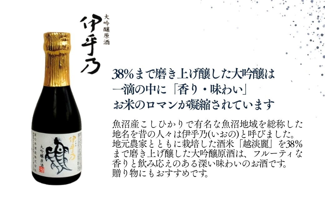 - 【日本酒】 大吟醸原酒 伊乎乃(いおの) 淡麗旨口 180ml×1本 クリアカートン入 高の井酒造 | 清酒 お酒 酒 さけ 地酒 新潟県 小千谷市 【0002-0422】