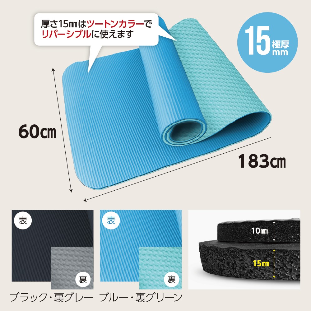 - ストレッチマット 厚手 15mm 【ブラック/グレー】【ブルー/グリーン】ヨガマット ストレッチ 極厚 クッション マット まっと リハビリ リラックス 効果 筋肉 運動 健康 ストレス解消 ヨガ 体操 エクササイズ ピラティス 筋トレ 自宅 在宅 NBR 持ち運び 防音 mat カーボーイ 東金 千葉県
