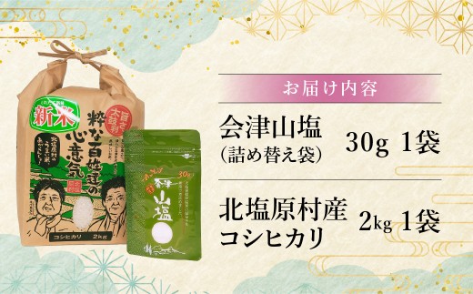 - 【3ヵ月定期便】「会津山塩」と「北塩原村産コシヒカリ×2kg」のセット 【 ふるさと納税 人気 おすすめ ランキング 会津山塩 コシヒカリ 北塩原村産 塩 棚田米 山塩 セット 定期便 福島県 北塩原村 送料無料 】 KBM021