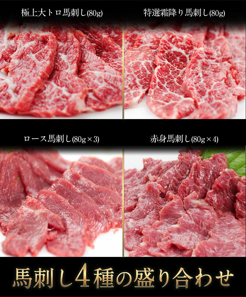 【ふるさと納税】【楽天限定】馬刺し4種の盛り合わせ【極上大トロ馬刺し80g/特選霜降り馬刺し80g/ロース馬刺し80g×3/赤身馬刺し80g×4】+タレ360ml付き《30日以内に出荷予定(土日祝除く)》