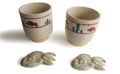 - 金魚絵湯呑2客と金魚箸置2客 [№5990-0031]