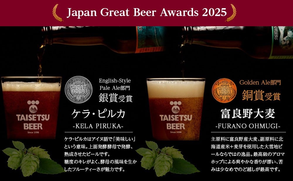 3種類の地ビールセットがもらえます。キレとコクが自慢の「大雪ピルスナー」は、爽やかな味わいで2本入っています。フルーティーな香りが特徴の「ケラ・ピルカ」も2本、飲みやすさが魅力です。さらに、富良野産大麦と北海道産米を使用したオリジナルの「富良野大麦」発泡酒が2本加わり、合計6本のセットです。各ビールはアルコール分5%で、330mlの飲み切りサイズ。多様な味わいを楽しめる贅沢なセットです。