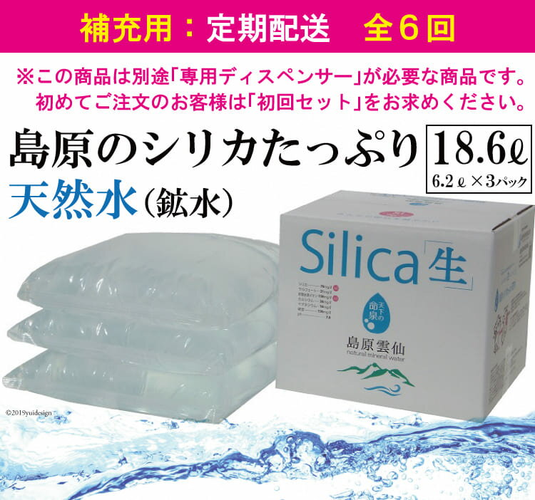 - 【ふるさと納税】(補充用・定期配送全6回)島原のシリカたっぷり天然水18.6L(6.2L×3パック)×6回【定期便 6回 補充 シリカ シリカ水 天然水 鉱水 ミネラル ミネラルウォーター 6.2L 3パック 18.6L 硬度130mg/l ph6.6 真空ビニールパック まろやか 飲みやすい】